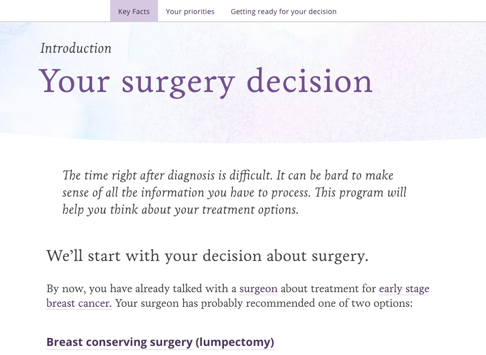 iCanDecide was the patient-facing educational component of SharES. It provided educational content including key facts about surgery, key facts about systemic treatment, emotional-self care, and genetic testing.